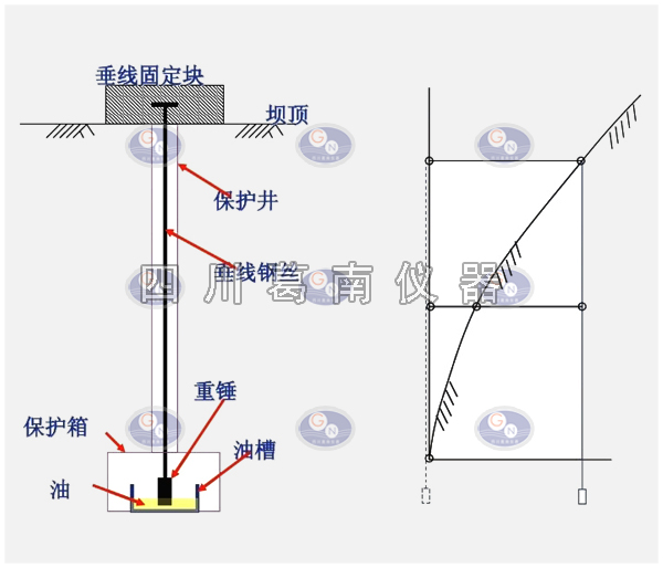 3.2.1正垂线一般设在坝体观测井、电梯井和宽缝处,钢丝上部固定在悬挂装置上,下部悬挂重锤。(重锤的重量与钢丝的粗细视垂线高度而定),由于重锤的作用,当垂线稳定时,始终处于铅直状态,从而利用铅直的垂线作为基准线,然后沿垂线不同高程处设立若干观测台或夹线装置,借助垂线座标仪,以此来测定各点的水平位移量,并计算出坝体挠度变形。